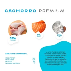- Análisis garantizado: proteína cruda 26 %, grasa bruta 14 %, cenizas crudas 6,3 %, fibra cruda 2,2 %, calcio 1,3 %, fósforo 1 %, ácidos grasos omega-3 0,38 %, ácidos grasos omega-6 3,02 %..