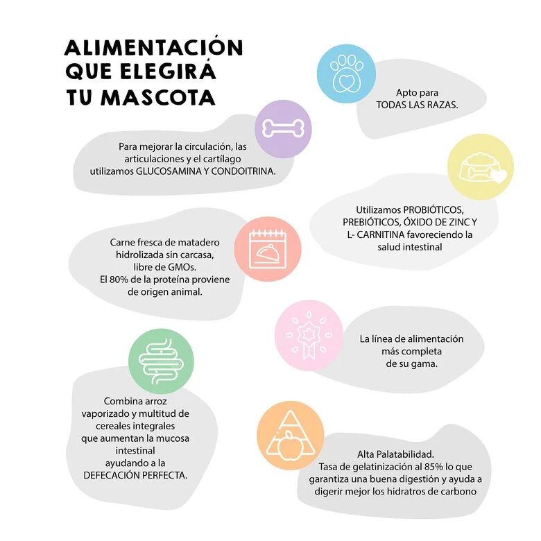 Composición: Pollo deshidratado 22%, arroz 19%, maíz integral 15%, trigo hidroliza- do, cerdo deshidratado 10%, grasa de pollo, cebada malteada, levadura de cerveza, hidrolizado de hígado de pollo, aceite de pescado rico en ?3, sustancias minerales, fibras vegetales (remolacha, manzana, lignocelulosa), hidroclorato de glucosamina, sulfato de condroitina, prebióticos, probióticos (E. faecium NCIMB 10415 10×106 UFC), L-carnitina.